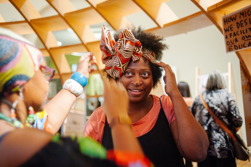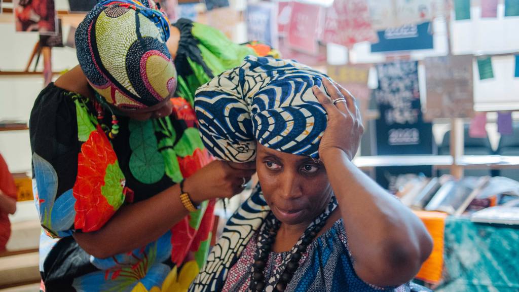 > Two makers creating head-wraps for each other while in conversation about their experiences as creative British Nigeria woman.