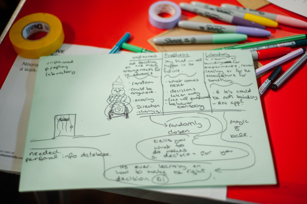 This session gave people three randomly generated words that described a new type of learning space, for example: A radical myth station; A poetic imagination club; An open manifesto train. People then designed how these places would work. The aim of the session was to explore how language affects our understanding of places and methods of learning.