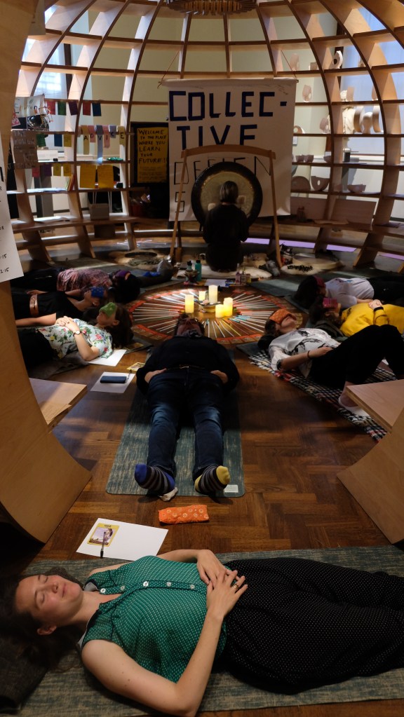 This session was a Guided Sound Meditation using a gong. Inviting people to lay on the floor and visualise their connection and relationship to the natural world.